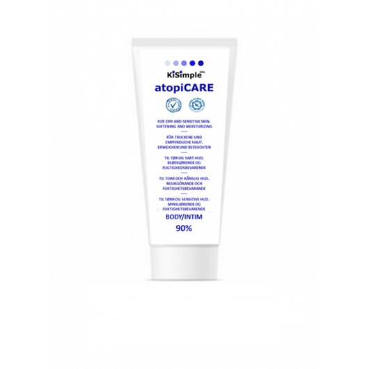 KiSimple atopiCARE 90% är en kräm som innehåller 90% fett. Krämen hjälper att bevara fukten och mjukgör huden. Krämen är speciellt anpassad för torr och irriterad hud och går snabbt in i huden.
