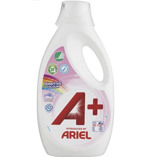 Flytande tvättmedel. Ariel A+ Sensitive White ger utmärkta resultat även vid låga temperaturer, effektiv redan vid 30 grader.Mer information