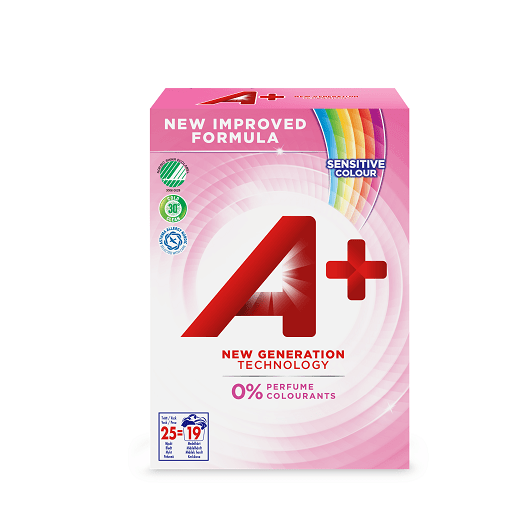 Pulvertvättmedel. A+ Sensitive görs utan parfym, utan fosfat och utan parabener, och erbjuder djup rengöring och omsorg för dina kläder, samtidigt som den bevarar tygernas färger och är extra skonsam mot huden.Mer information