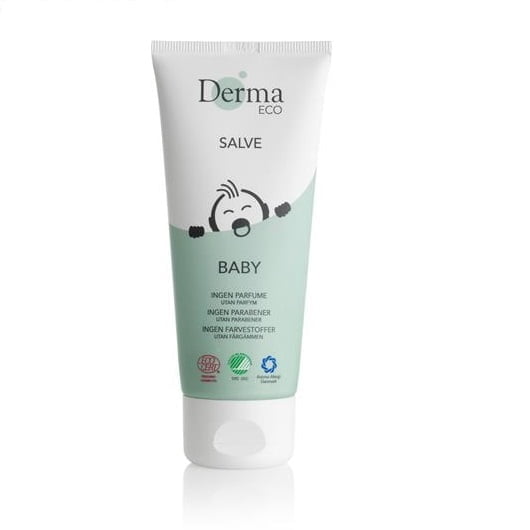 Derma Eco Baby salva med ekologisk aloe vera och aprikosolja är en särskilt vattenavisande salva med vårdande egenskaper. Den innehåller inte Zink och kan därför även användas som extra fuktgivande kräm i ansikte och till torra baby kinder och röd och irriterad mun efter amning. Salvan är särskilt lämplig för hud som utsätts för fukt kring munnen och blöjområdet. Derma Babysalva bildar en barriär som verkar som en skyddande hinna på huden samtidigt som huden kan andas. Absorberas snabbt utan att huden blir fet.