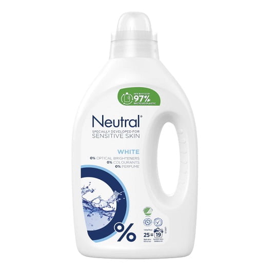Neutrals flytande tvättmedel White är särskilt utvecklad för känslig hud, är parfymfritt och innehåller inga färgämnen för att minimera risken för allergi och överkänslighet.