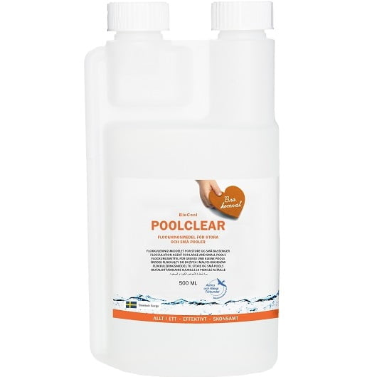 Clear my pool water är ett flockningsmedel som på ett enkelt sätt bidrar till att hålla vatten klart och fritt från partiklar. Ett vatten som börjar bli grumligt beror vanligtvis på någon av följande orsaker: filtret är mättat och klarar inte av att rena mer eller så är partiklarna är för små för att kunna fångas upp av filtret. Flockningsmedel kan användas i spabad, badtunnor och pooler som har ett fungerande filtersystem. Produkten från Biocool är både biologiskt nedbrytbar i naturen och tillverkad i Sverige.